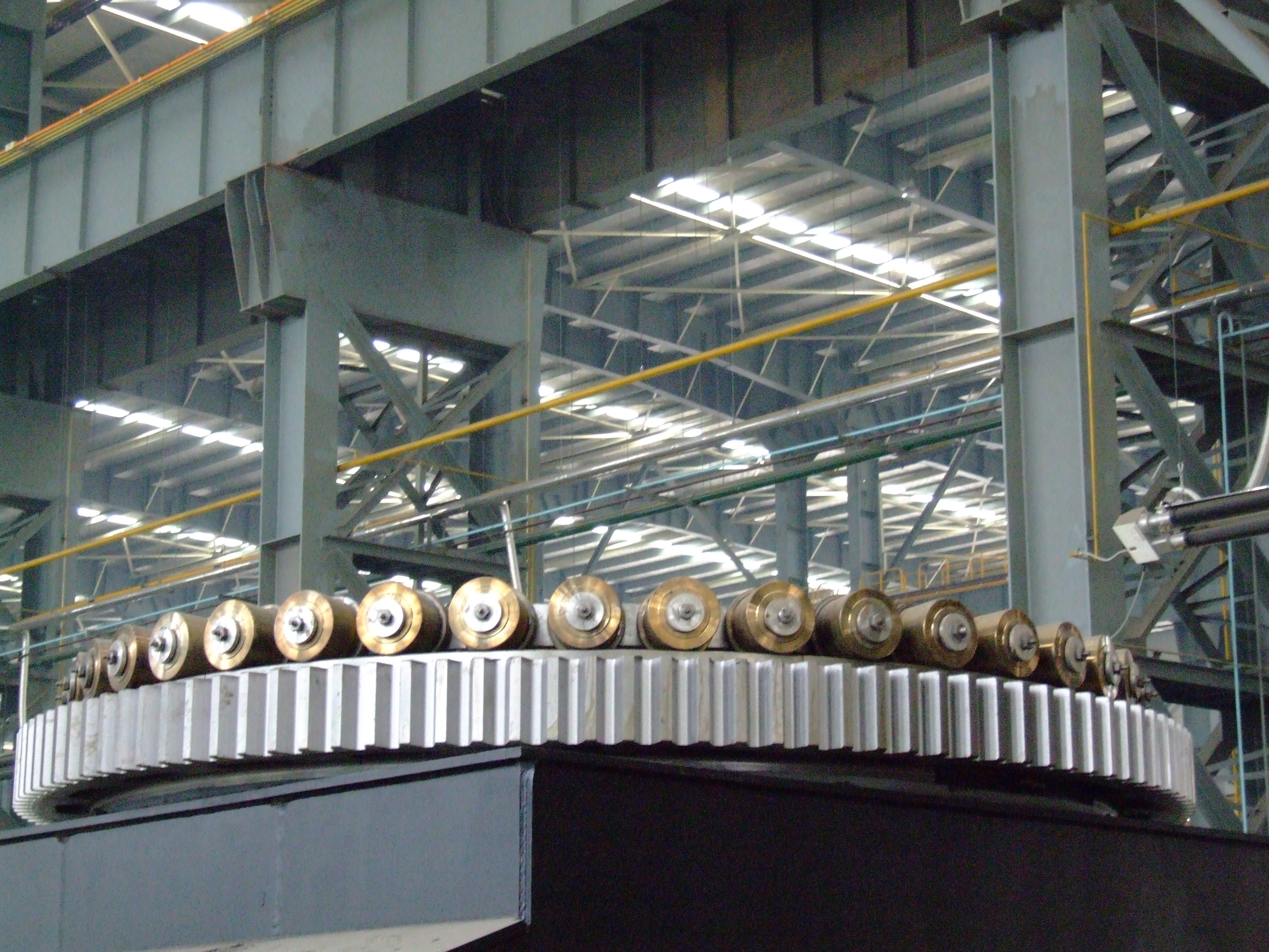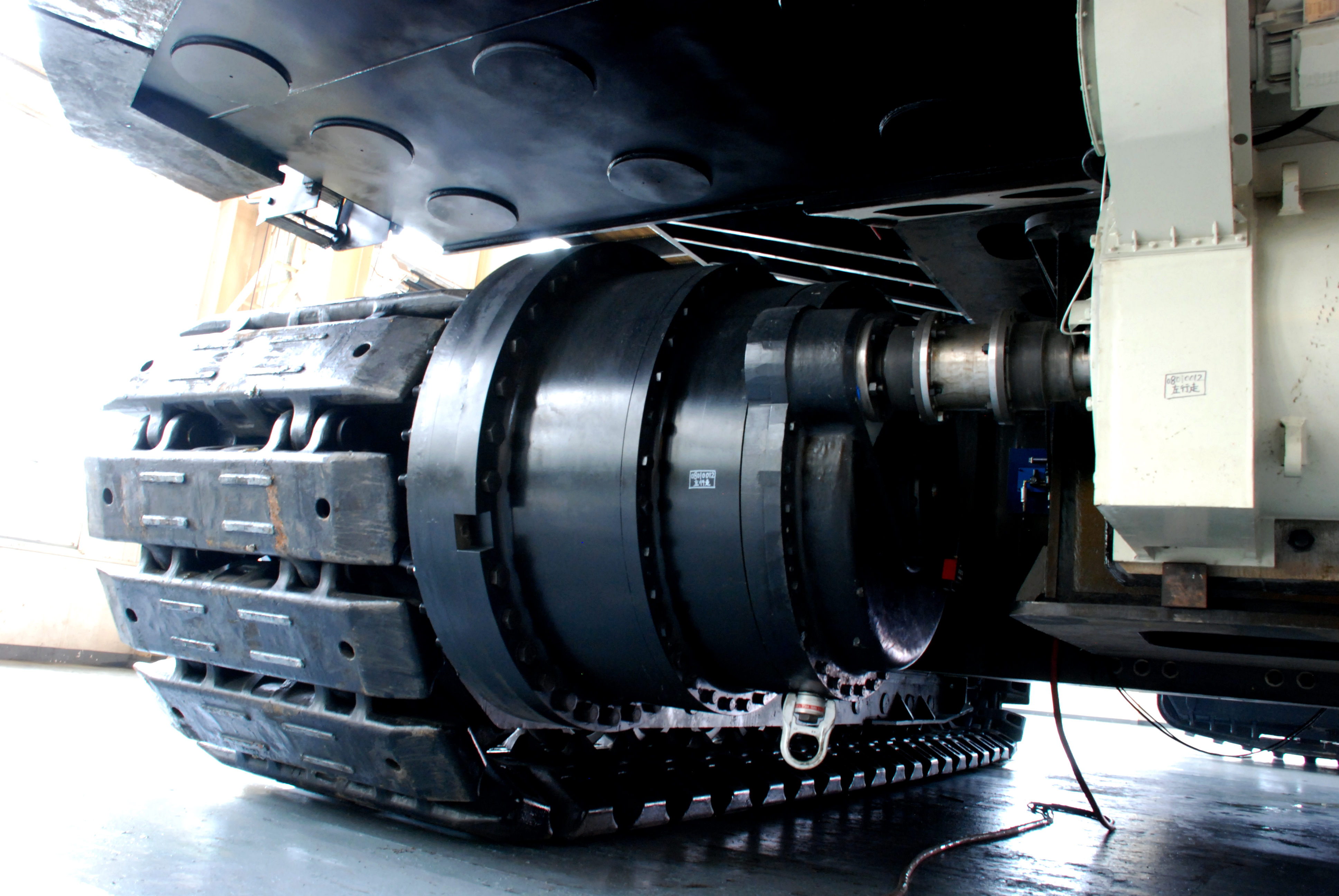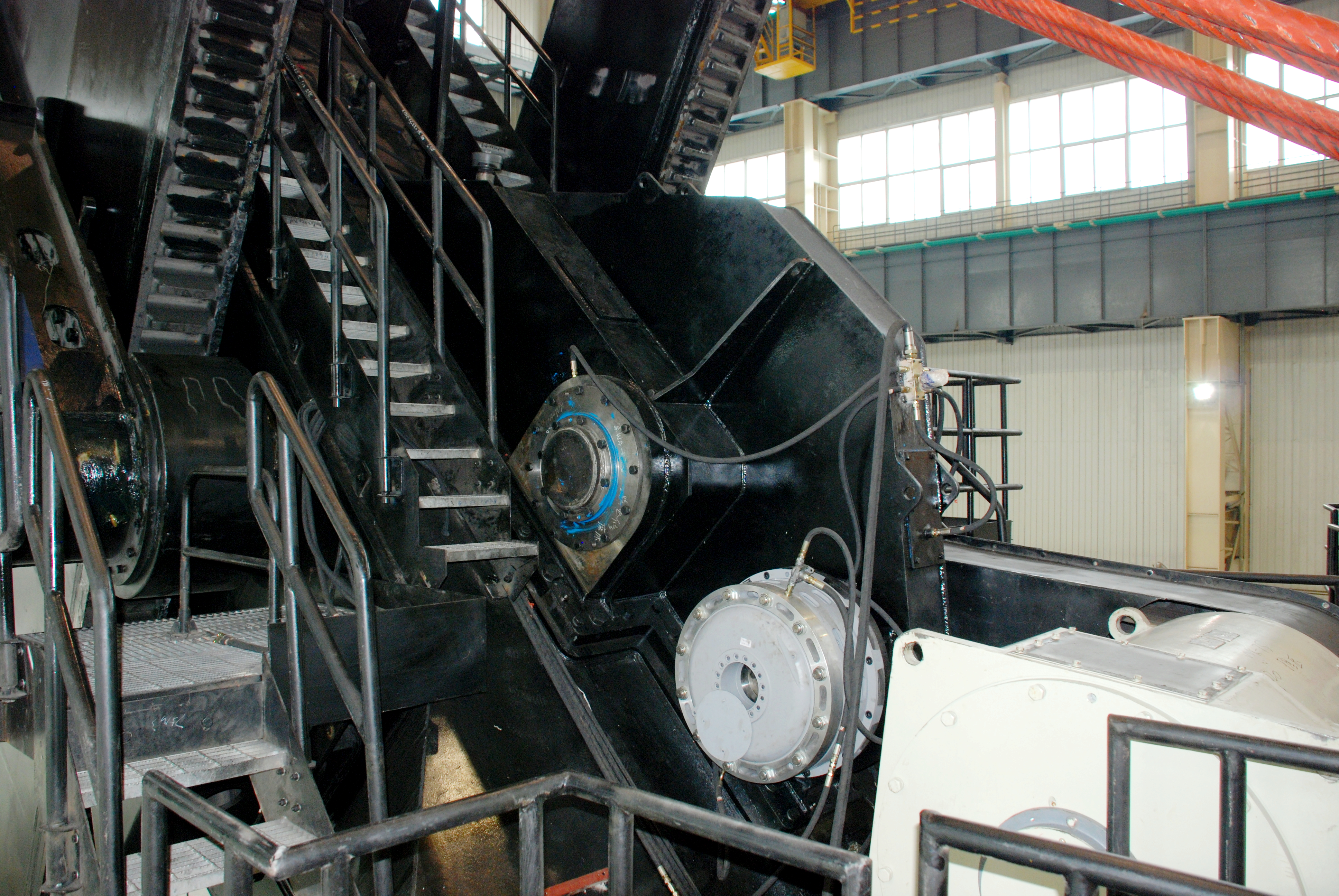 行走減速機(jī)由電機(jī)驅(qū)動(dòng)挖掘機(jī)的走行。減速機(jī)輸入軸為實(shí)心花鍵軸,與電機(jī)通過聯(lián)軸器聯(lián)接,輸出軸為空心花鍵軸,與履帶驅(qū)動(dòng)軸聯(lián)接;回轉(zhuǎn)減速機(jī)安裝在回轉(zhuǎn)平臺(tái)上,為回轉(zhuǎn)機(jī)構(gòu)的一級(jí)減速機(jī)。電機(jī)驅(qū)動(dòng)減速機(jī),減速機(jī)輸出空心軸與回轉(zhuǎn)立軸聯(lián)接,回轉(zhuǎn)立軸齒輪與回轉(zhuǎn)大齒圈嚙合,實(shí)現(xiàn)挖掘機(jī)的回轉(zhuǎn)運(yùn)動(dòng);提升減速機(jī)為挖掘機(jī)提升機(jī)構(gòu)的主傳動(dòng)設(shè)備,用于驅(qū)動(dòng)提升卷筒。與回轉(zhuǎn)平臺(tái)的聯(lián)接型式為鉸接聯(lián)接,楔塊定位,相對獨(dú)立于回轉(zhuǎn)平臺(tái)之外,...