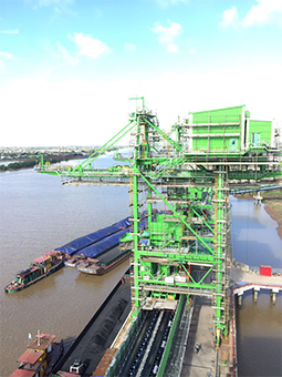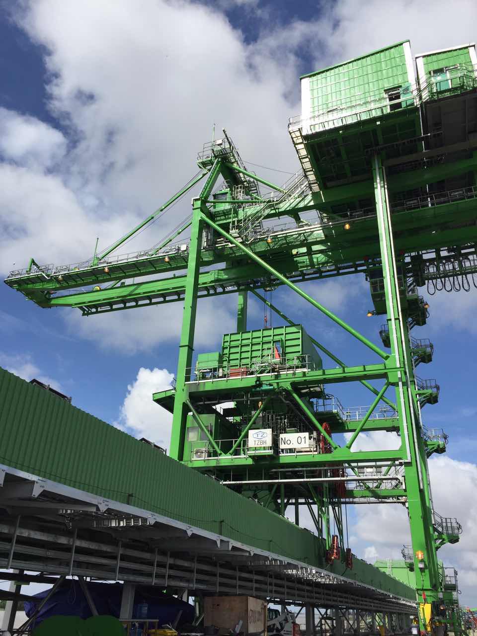 橋式抓斗卸船機(jī),以帶有抓斗的小車沿橋架作周期運行的散貨卸船機(jī)。作業(yè)時,抓斗自船艙抓取散貨并提升出倉后載重小車向岸方運行,將散貨卸入前門框內(nèi)的漏斗內(nèi),經(jīng)膠帶輸送機(jī)系統(tǒng)送入貨場。