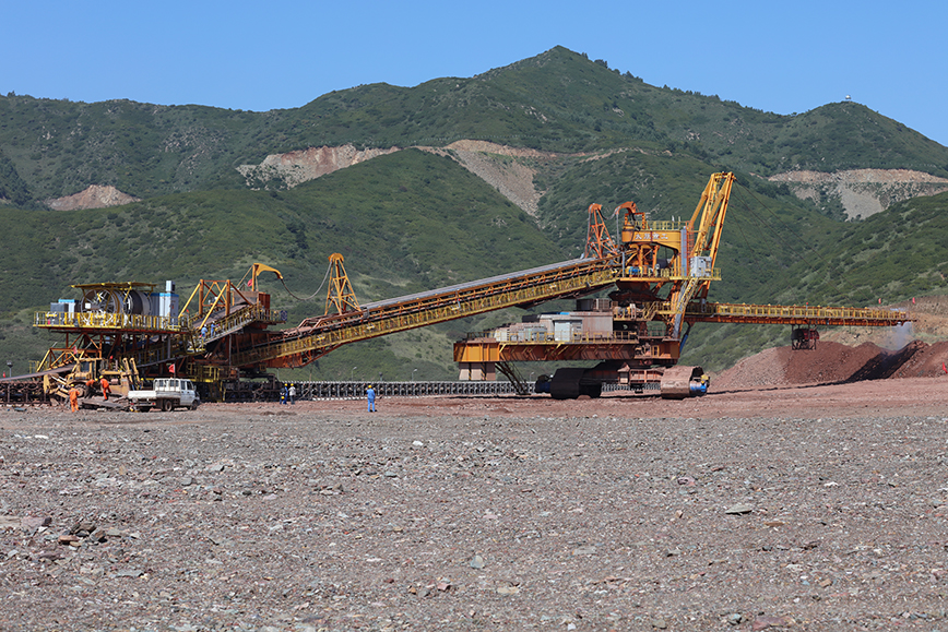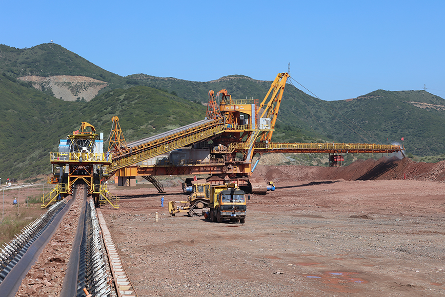 排土機(jī)位于大型露天礦山半連續(xù)開采系統(tǒng)的末端,用于運輸和排棄物料。排土機(jī)與卸料車協(xié)同工作:卸料車完成物料的提升,將物料傳送至排土機(jī)的受料皮帶上,排土機(jī)將卸料車輸送來的物料通過排料臂有序排棄至排土場;排土機(jī)與卸料車互鎖聯(lián)動完成排土作業(yè)。排土機(jī)按照排土工藝隨排土場的推進(jìn)而移動。