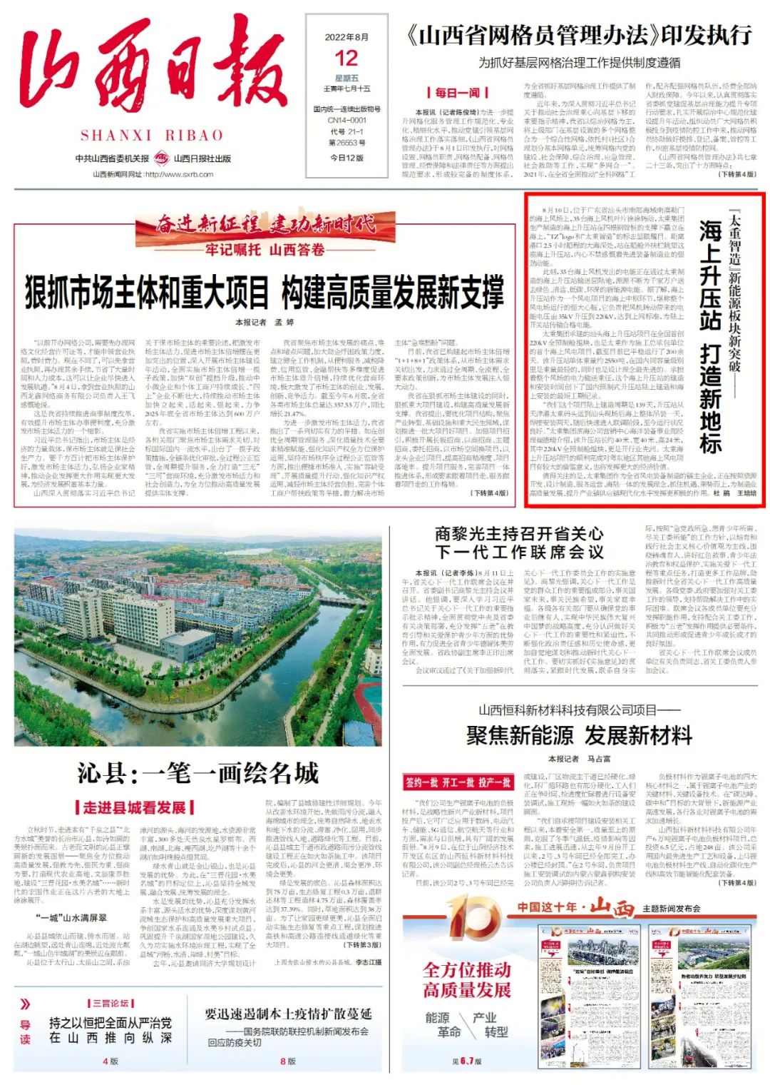 8月12日,山西日報頭版以《“太重智造”新能源板塊新突破——海上升壓站 打造新地標(biāo)》為題,對太重集團生產(chǎn)制造的海上升壓站進行了全面報道。太重集團作為全省風(fēng)電裝備制造的“鏈主”企業(yè),正在按照資源開發(fā)、設(shè)計制造、服務(wù)運營、海陸一體的發(fā)展理念,抓住機遇、乘勢而上,為制造業(yè)高質(zhì)量發(fā)展、提升產(chǎn)業(yè)鏈供應(yīng)鏈現(xiàn)代化水平發(fā)揮更積極的作用。