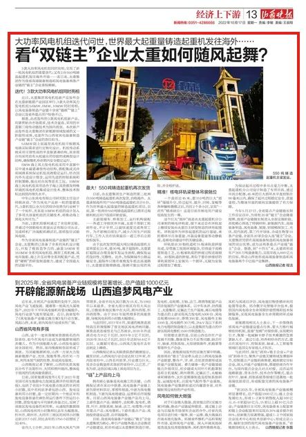 10月17日,山西晚報(bào)刊發(fā)《看“雙鏈主”企業(yè)太重如何隨風(fēng)起舞?》文章,對(duì)太重集團(tuán)3款大功率風(fēng)電機(jī)組、550噸鑄造起重機(jī)、核電環(huán)軌梁進(jìn)行報(bào)道。太重集團(tuán)作為我省唯一一家“雙鏈主”企業(yè),深耕智能高端裝備制造和風(fēng)電裝備領(lǐng)域,實(shí)施一系列提質(zhì)、增效、擴(kuò)量的升級(jí)改造項(xiàng)目,實(shí)現(xiàn)“設(shè)計(jì)研發(fā)、智能控制、三電總成、整體集成”的發(fā)展格局,集聚產(chǎn)業(yè)鏈優(yōu)勢(shì)資源,強(qiáng)化上下游產(chǎn)業(yè)協(xié)同,勇?lián)版溨鳌逼髽I(yè)責(zé)任,推動(dòng)我省制造業(yè)高質(zhì)量發(fā)展,為轉(zhuǎn)型發(fā)展蹚新路持續(xù)注入強(qiáng)勁動(dòng)能。