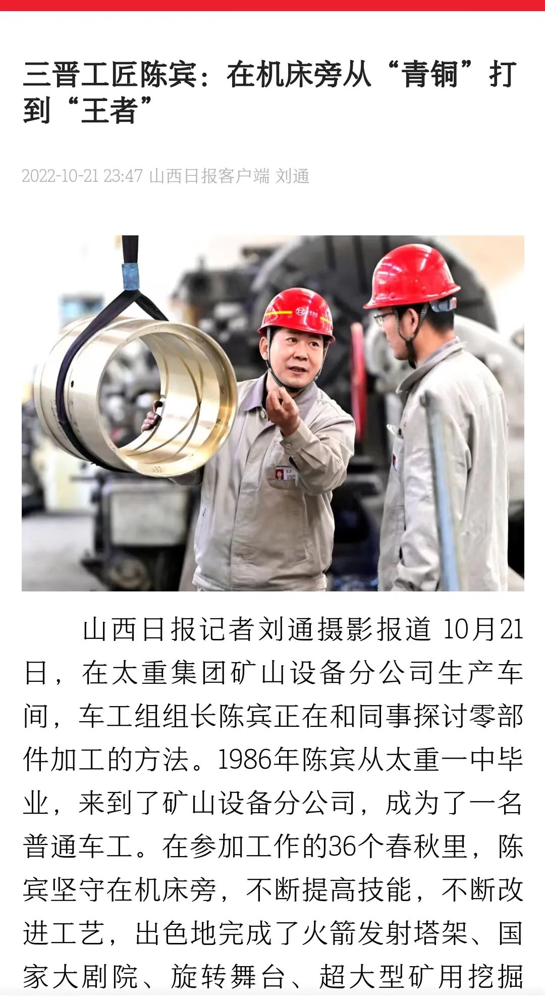 10月21日,山西日報以《三晉工匠陳賓:在機床旁從“青銅”打到“王者”》為題,對太重職工陳賓進行了報道。陳賓36年來潛心鉆研、不斷創(chuàng)新、精益求精,致力于大型關鍵零件的精加工任務,成為一名名副其實的“三晉工匠”。