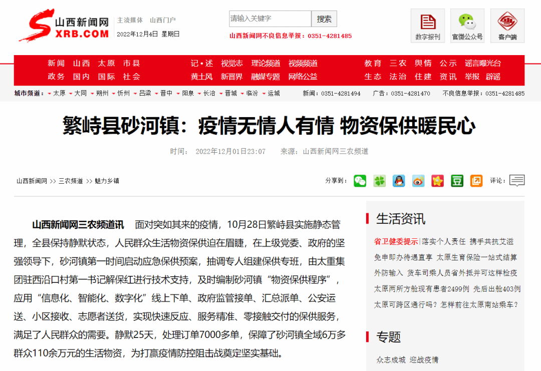 近日,山西新聞網(wǎng)刊發(fā)《繁峙縣砂河鎮(zhèn):疫情無(wú)情人有情 物資保供暖民心》文章,報(bào)道太重集團(tuán)駐村工作隊(duì)面對(duì)疫情嚴(yán)峻形勢(shì),迅速響應(yīng)、積極應(yīng)戰(zhàn),協(xié)助砂河鎮(zhèn)高效快捷完成物資保供任務(wù),用行動(dòng)扛起疫情防控責(zé)任,為打贏(yíng)疫情防控攻堅(jiān)戰(zhàn)貢獻(xiàn)國(guó)企力量。