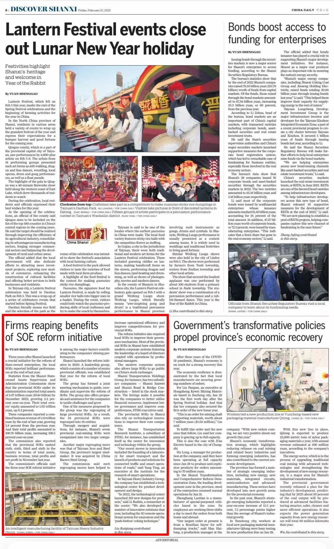 2月10日,中國日報全英文刊發(fā)《Firms reaping benefits of SOE reform initiative》文章,報道太重扎實推進國企改革三年行動,探索科技創(chuàng)新體系和高端裝備制造產業(yè)深度融合的發(fā)展新路,營造了良好的創(chuàng)新生態(tài),夯實了公司轉型發(fā)展的堅實根基。