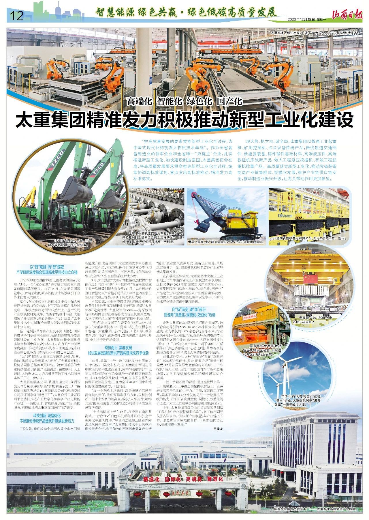 今日,山西日?qǐng)?bào)整版刊發(fā)《高端化 智能化 綠色化 國產(chǎn)化 太重集團(tuán)精準(zhǔn)發(fā)力積極推動(dòng)新型工業(yè)化建設(shè)》文章,從產(chǎn)學(xué)研用深度融合、傳統(tǒng)產(chǎn)品迭代升級(jí)、加快發(fā)展戰(zhàn)略性新興產(chǎn)品、打造綠色批量裝備等方面,詳細(xì)報(bào)道太重高質(zhì)量落實(shí)新型工業(yè)化的生動(dòng)實(shí)踐,講述公司作為全省唯一“雙鏈主”企業(yè),持續(xù)推動(dòng)我省裝備制造產(chǎn)業(yè)鏈集群式、規(guī)?;l(fā)展的務(wù)實(shí)之舉。