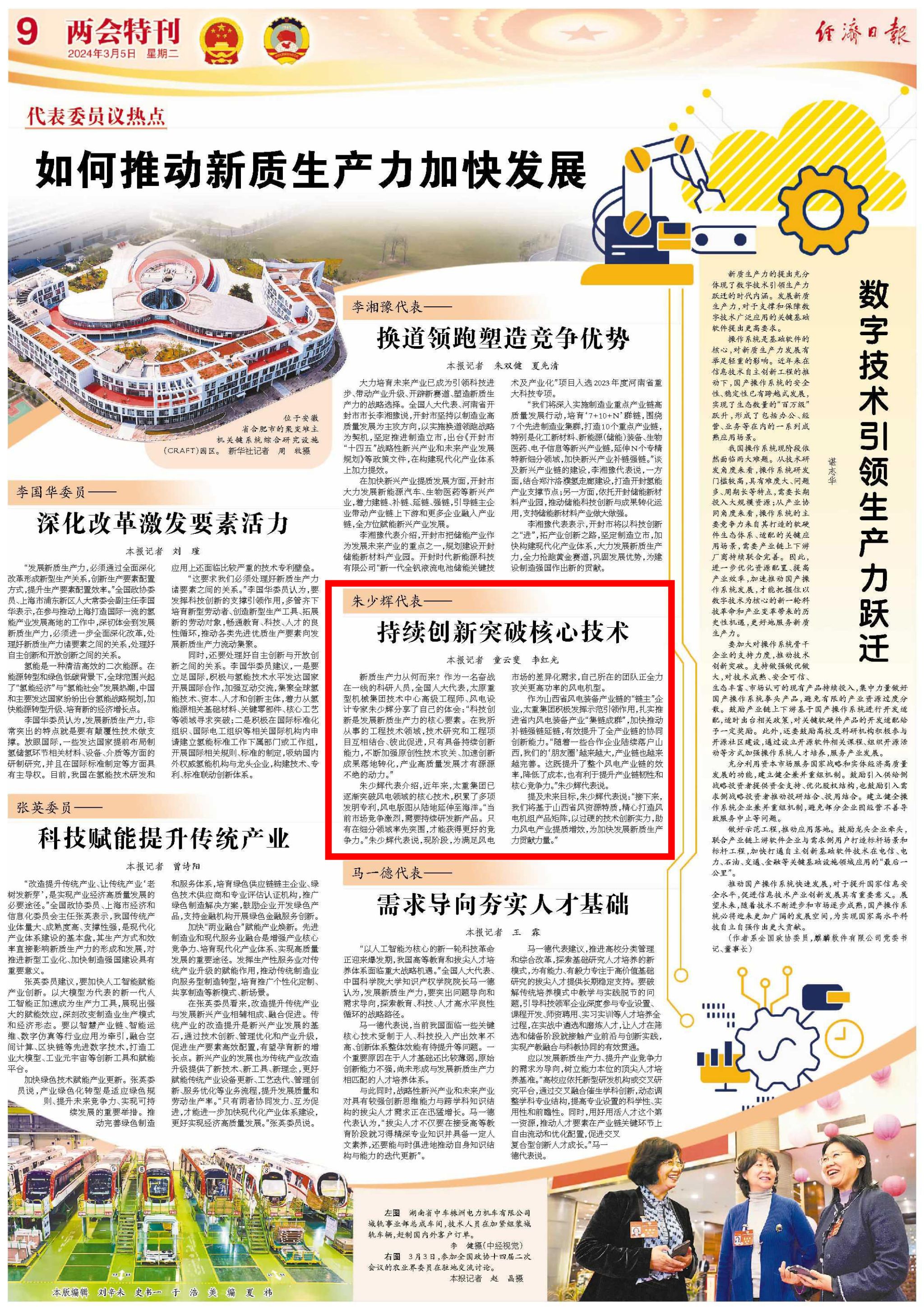 全國(guó)兩會(huì)即將召開(kāi),朱少輝早早完成了前期的調(diào)研和準(zhǔn)備,他計(jì)劃從能源綜合改革與重點(diǎn)產(chǎn)業(yè)鏈發(fā)展方面提出建議,希望把新能源產(chǎn)業(yè)與高端裝備制造業(yè)更緊密結(jié)合,以新質(zhì)生產(chǎn)力催生新能源高地,為發(fā)揮太重“雙鏈主”龍頭帶動(dòng)作用、振興山西制造業(yè)出一份力。