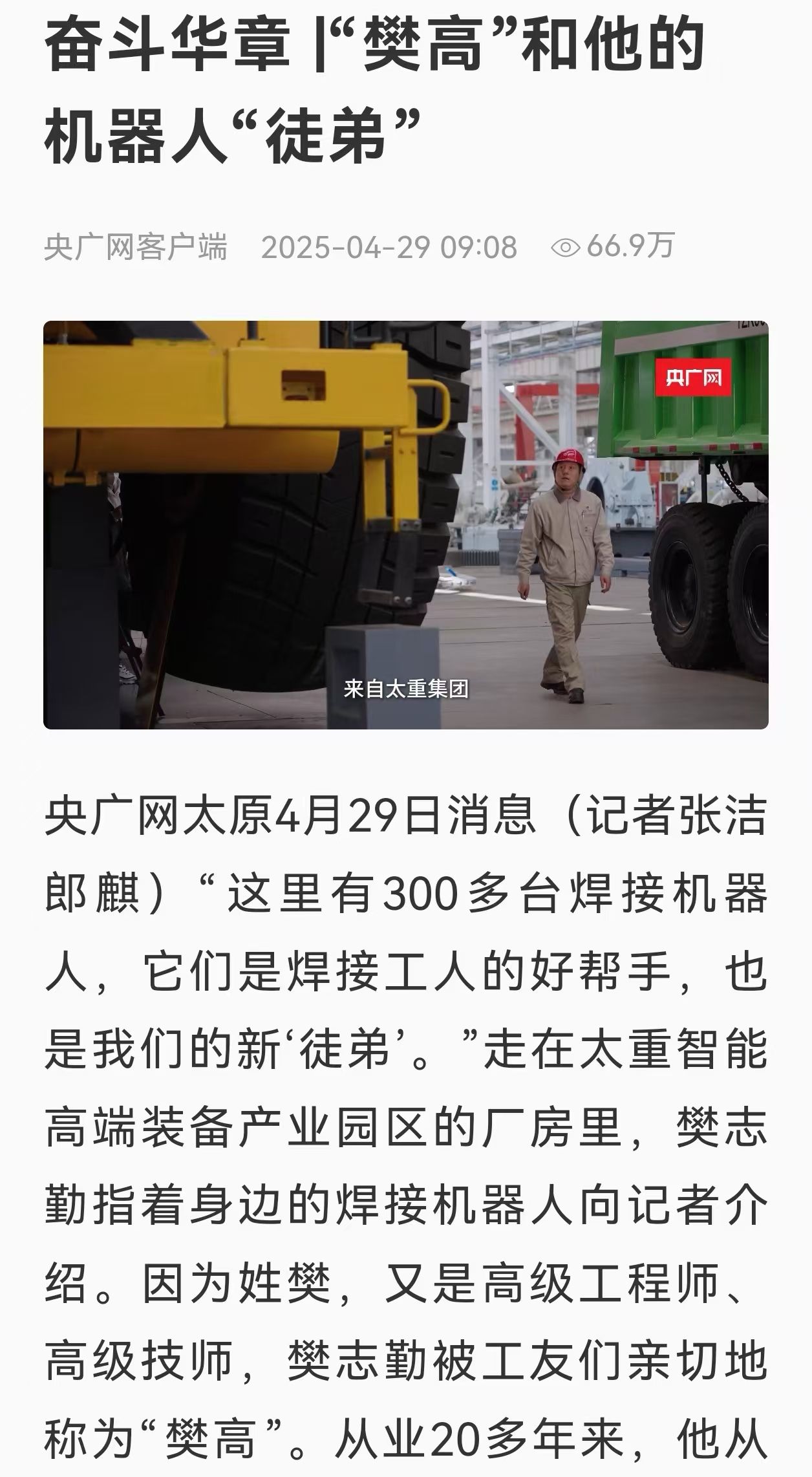 “五一”國(guó)際勞動(dòng)節(jié)之際,央廣網(wǎng)發(fā)布專題視頻《奮斗華章|“樊高”和他的機(jī)器人“徒弟”》,聚焦太重集團(tuán)全國(guó)勞模、大國(guó)工匠樊志勤,講