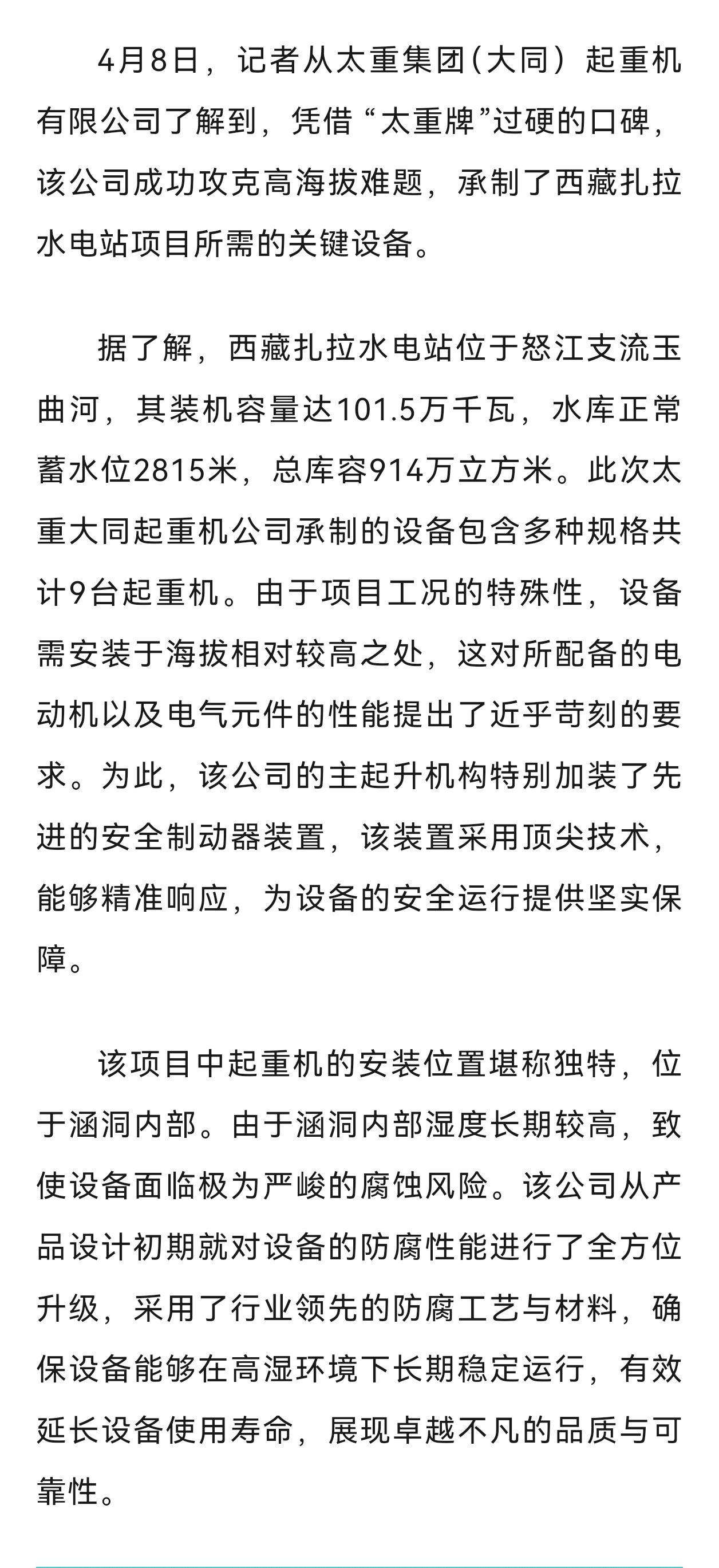 喜訊傳來,振奮人心!太重集團(tuán)(大同)起重機有限公司佳績不斷,再獲矚目。此前助力攀枝花項目,憑借出色表現(xiàn)受到媒體關(guān)注。4月9日,《大同日報》頭版再度聚焦報道,太重集團(tuán)(大同)起重機有限公司攻克高海拔難題,成功承制了西藏扎拉水電站項目關(guān)鍵設(shè)備承制任務(wù)。