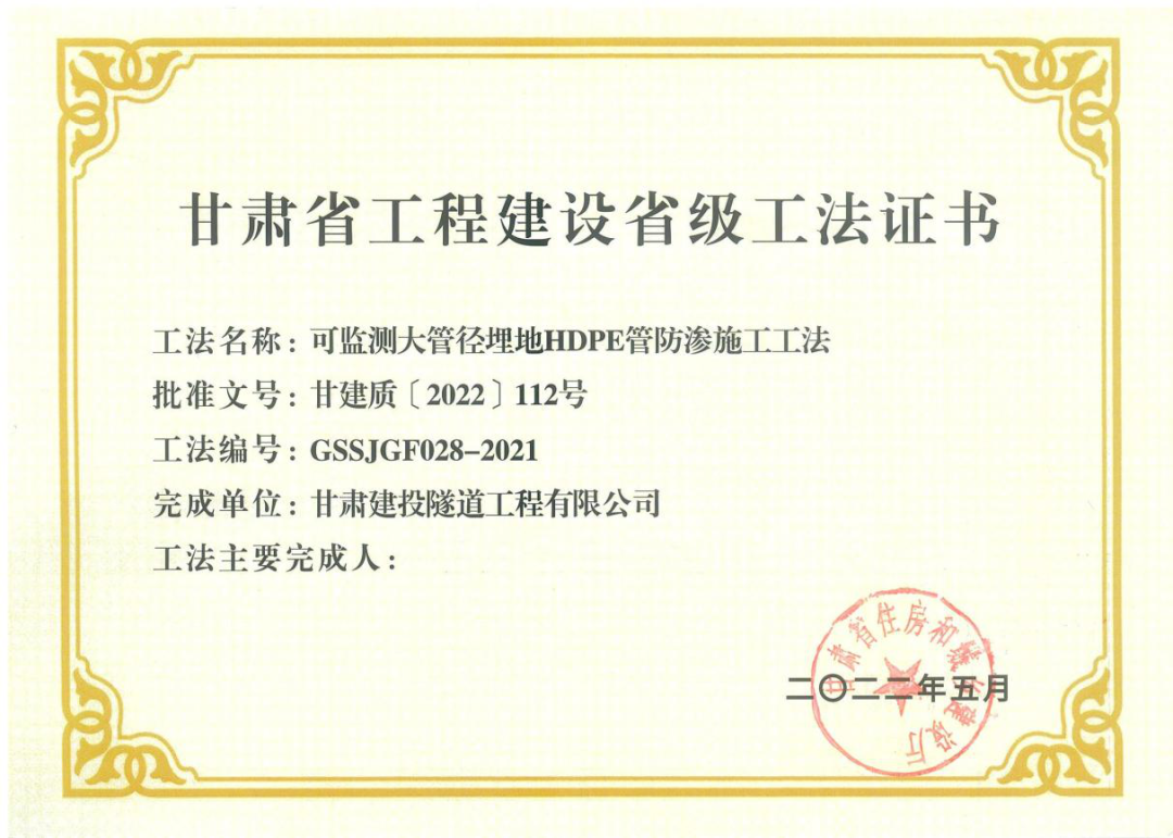 另外,二公司申報的省級工法《可監(jiān)測大管徑埋地HDPE管防滲施工工法》被評為2022年度省級優(yōu)秀工法。該工法是針對管徑大、管道埋設(shè)較深、排水量大、鋪設(shè)點地質(zhì)復(fù)雜(特別是西北區(qū)域濕陷性黃土地區(qū))、管道接口施工質(zhì)量難以保證、管道破損危害大且維修檢測困難等問題提出來的,經(jīng)一年多來的實踐證明,本工法技術(shù)先進、安全適用,效益顯著,值得向全社會推廣應(yīng)用,有良好的應(yīng)用前景。