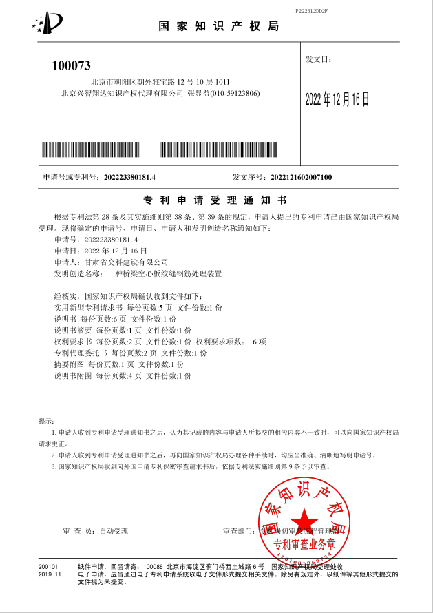 近日,交科公司二公司申報的《一種橋梁橫隔板安裝吊籃機構(gòu)》榮獲國家知識產(chǎn)權(quán)局實用新型專利授權(quán),《一種橋梁空心板絞縫鋼筋處理裝置》成功被國家知識產(chǎn)權(quán)局受理。