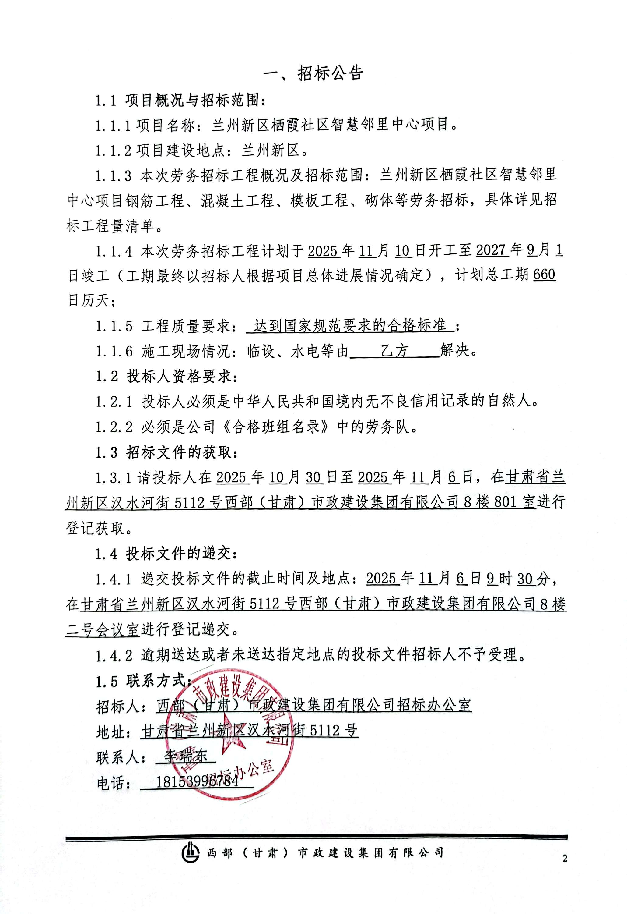 蘭州新區(qū)棲霞社區(qū)智慧鄰里中心項(xiàng)目-鋼筋工程、混凝土工程、砌體工程等勞務(wù)-招標(biāo)公告