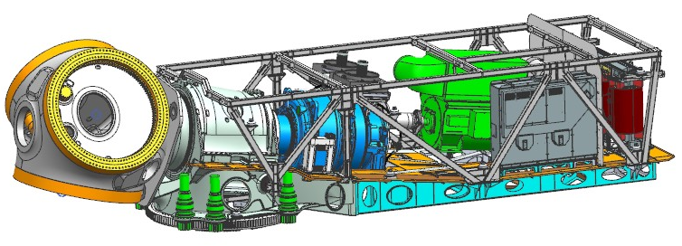 在國內較早提出并應用發(fā)電系統(tǒng)(發(fā)電機、變流器、干式升壓變壓器)上置技術,集成電氣系統(tǒng)、冷卻系統(tǒng),機械承載結構與動力學分析。具有電纜數(shù)量少、易施工、塔內線損少等優(yōu)勢,免除箱變土建,減少整機和風電場綜合成本。