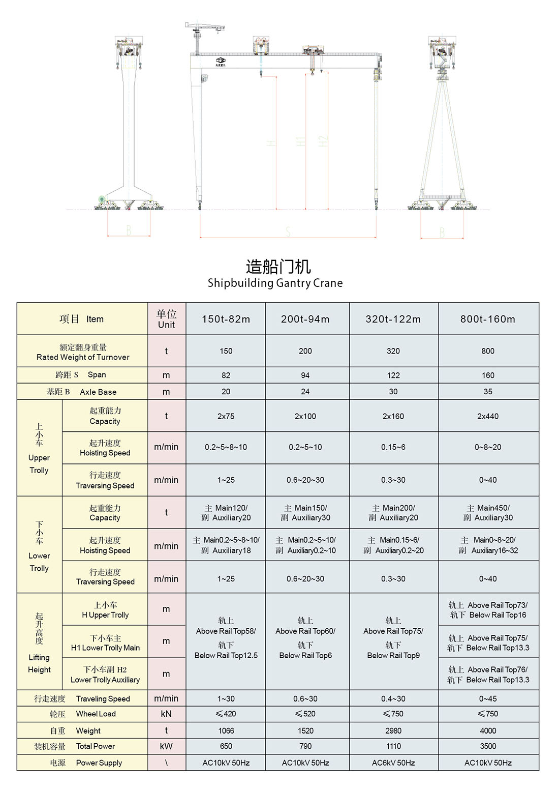 造船門機(jī)在地面軌道上運(yùn)行,用于船塢等大型焊接件吊裝作業(yè)的大型龍門起重機(jī),由水平橋架設(shè)置在兩條支腿上構(gòu)成門架形狀的橋架型起重機(jī)。其起升、小車運(yùn)行、橋架與橋式起重機(jī)相同。