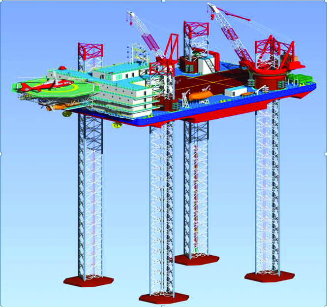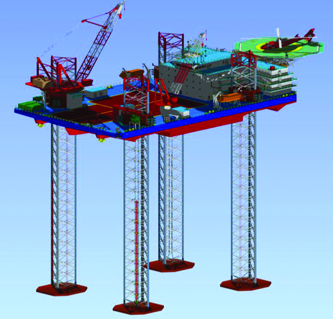 多功能輔助作業(yè)平臺(tái)一般配備三到四個(gè)樁腿,樁腿采用桁架或圓筒結(jié)構(gòu),具有自行升降功能。作業(yè)時(shí)樁腿扎入海床固定,甲板可自由調(diào)節(jié)高度;移動(dòng)時(shí)收回樁腿,依靠甲板浮于海面