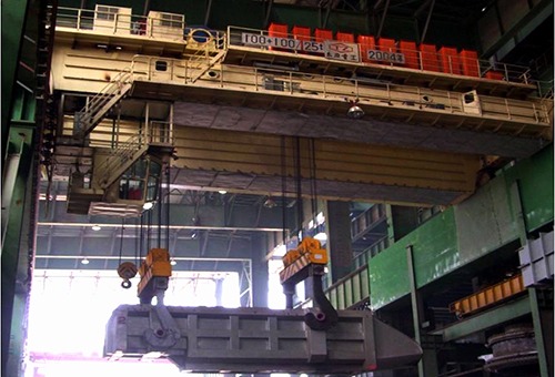 轉(zhuǎn)爐煉鋼過程中配置料箱起重機,主要用于添加冷料作業(yè)。電爐加料起重機主要用于向電爐加廢鋼,與鑄造起重機主要區(qū)別在于主起升機構(gòu)可以不考慮單機工作的工況