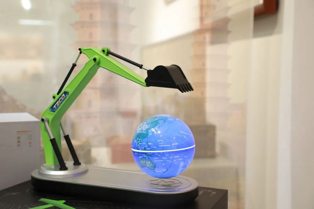 以明星產品氫能源挖掘機為原型,使用磁懸浮先進技術,托起空中的蔚藍星球。重型機械的磅礴力量在此升華為桌面空間的科技美學,生動訴說著太重“掘勝全球”的壯志——以智能化與綠色化駛向全球大市場!