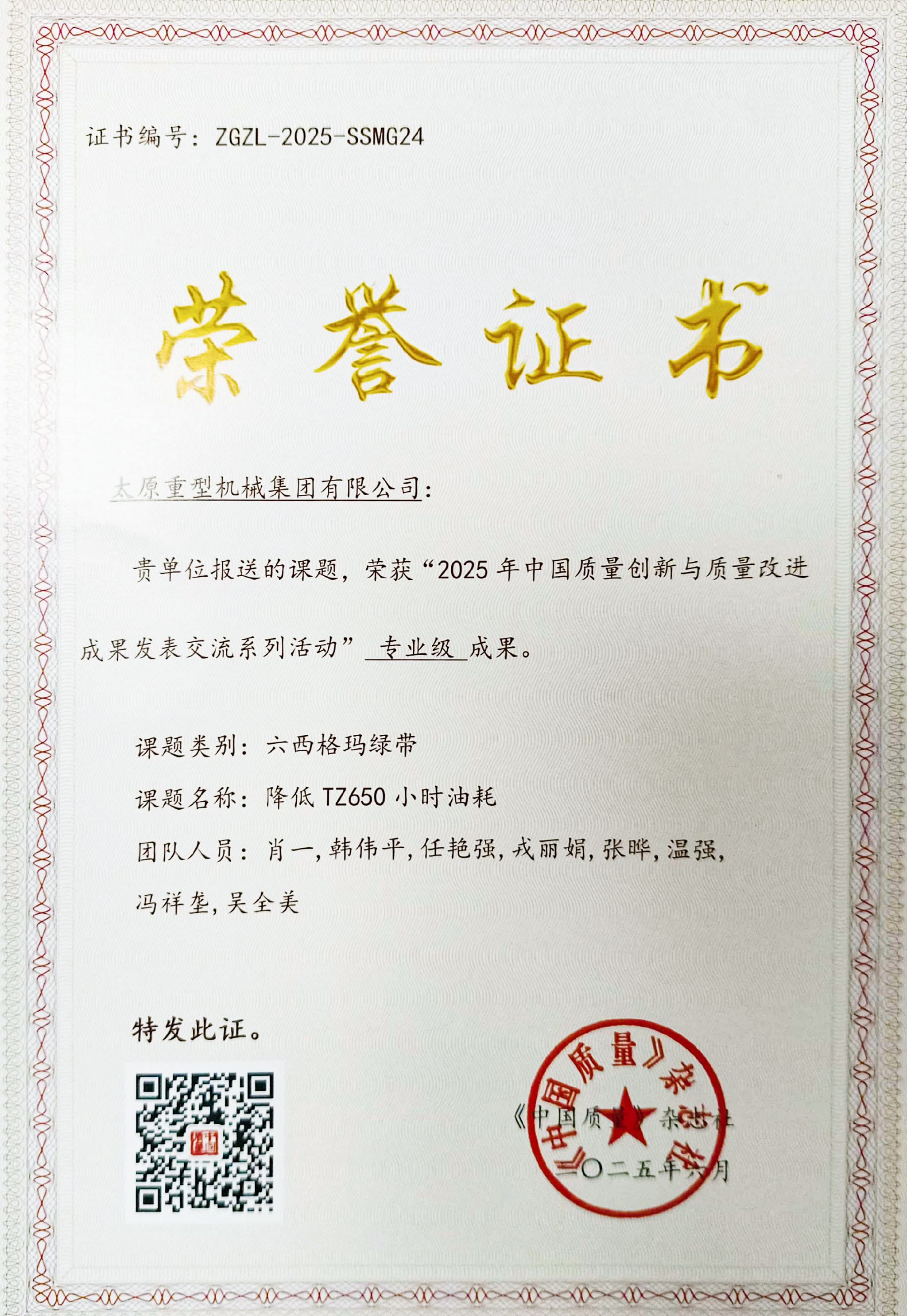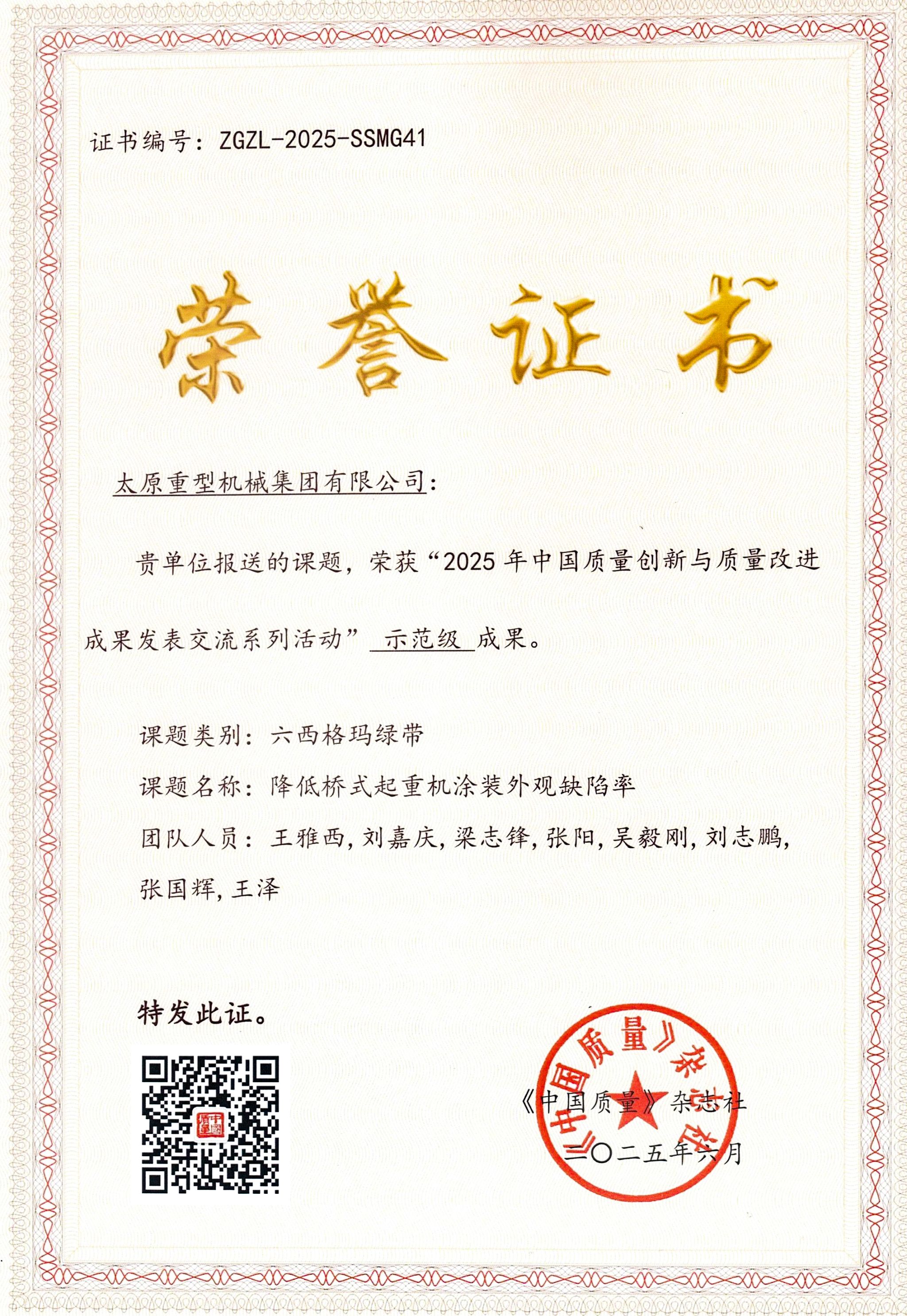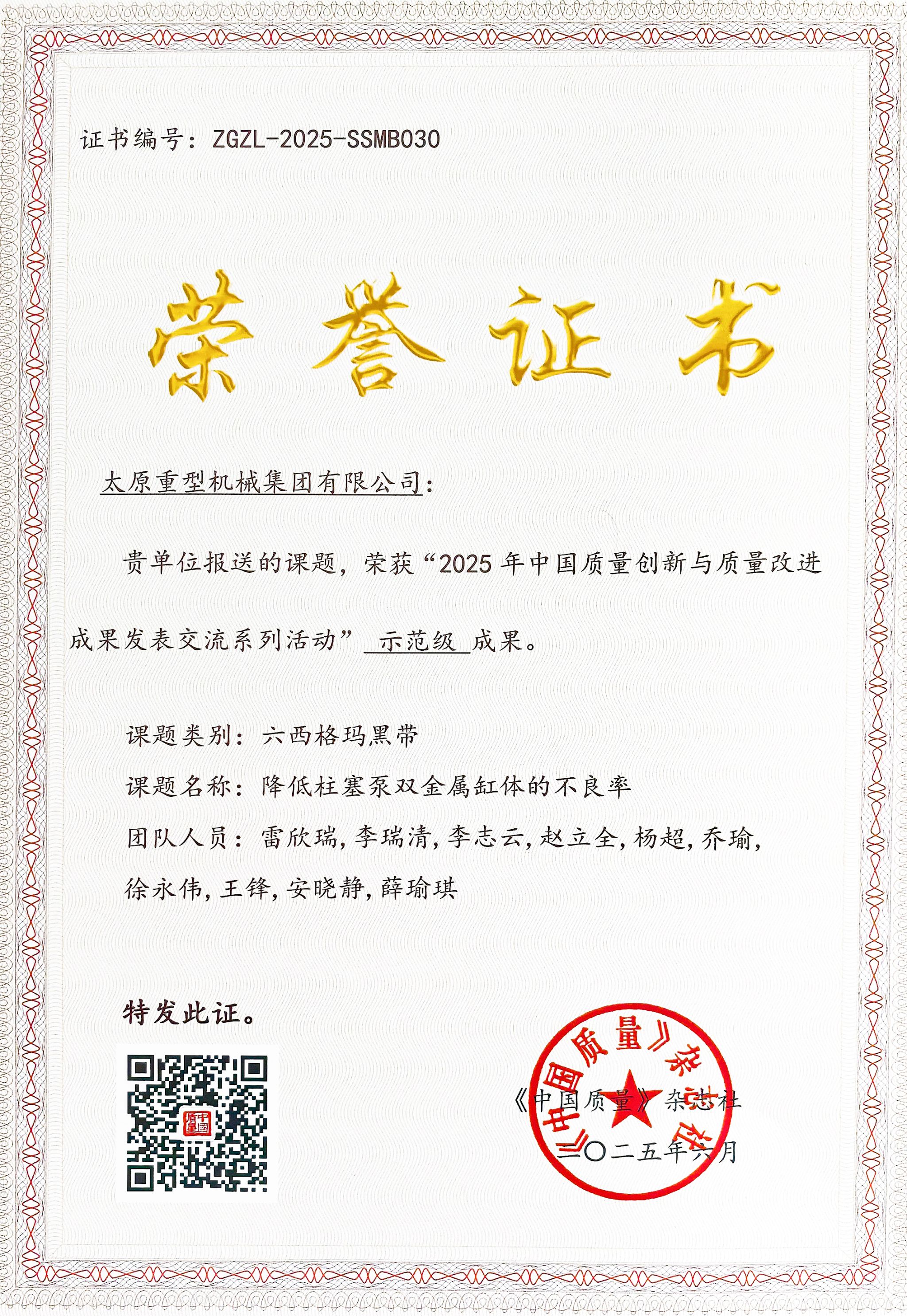 這份成績源自持續(xù)的質(zhì)量管理投入。在中國質(zhì)量協(xié)會《中國質(zhì)量》雜志社組織的“2025年中國質(zhì)量創(chuàng)新與質(zhì)量改進成果發(fā)表交流系列活動”中,太重報送的6項六西格瑪成果憑借突出的技術(shù)創(chuàng)新性和實際效益脫穎而出,成功斬獲“示范級”“專業(yè)級”成果獎項,這也是太重連續(xù)第二年在該權(quán)威活動中榮獲獎項。