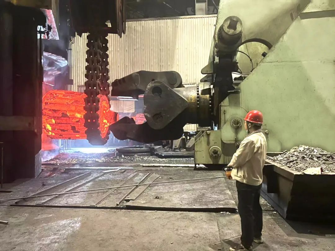 工作人員操控行車配合鍛造壓機完成生產(chǎn)
